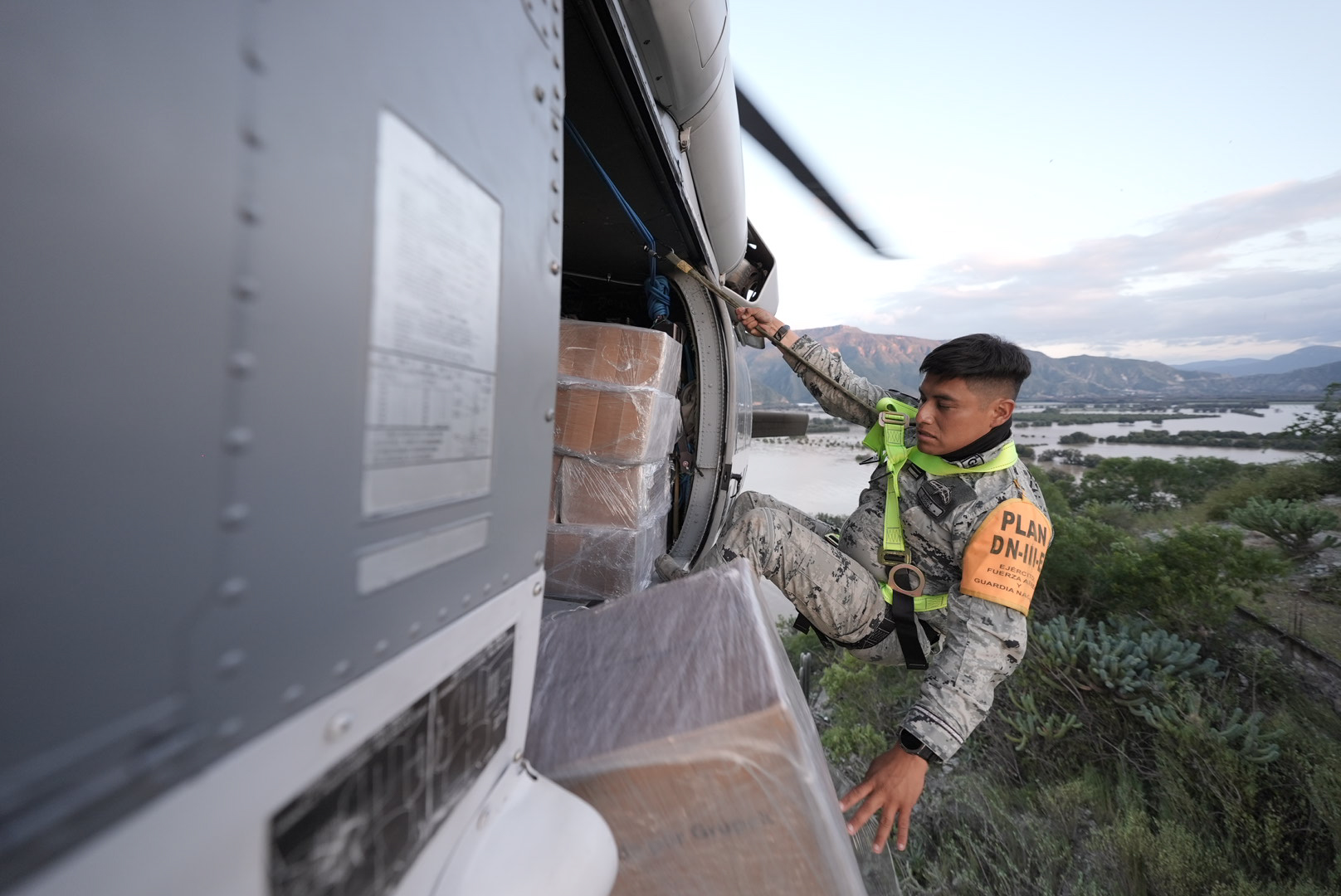 Elementos del Ejército Mexicano hacen llegar ayuda humanitaria por aire a las comunidades que aún se encuentran incomunicadas vía terrestre, comunidades sin una planicie dónde puedan aterrizar los helicópteros.